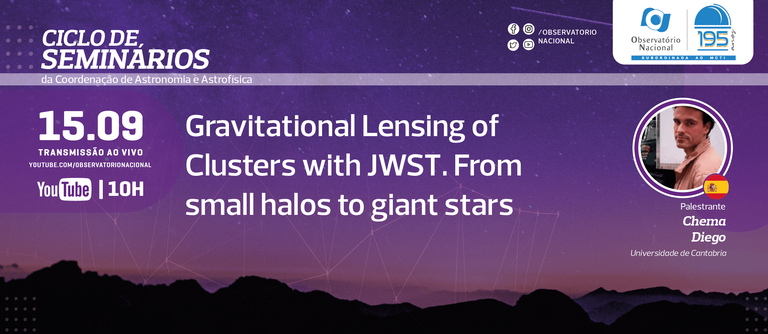 O tema do próximo evento, que acontecerá às 10h (horário de Brasília), com transmissão ao vivo por meio do Canal do ON no YouTube, será “Gravitational Lensing of Clusters with JWST”. Para falar sobre o assunto, foi convidado o pesquisador Chema Diego, da Universidade de Cantabria (Espanha).