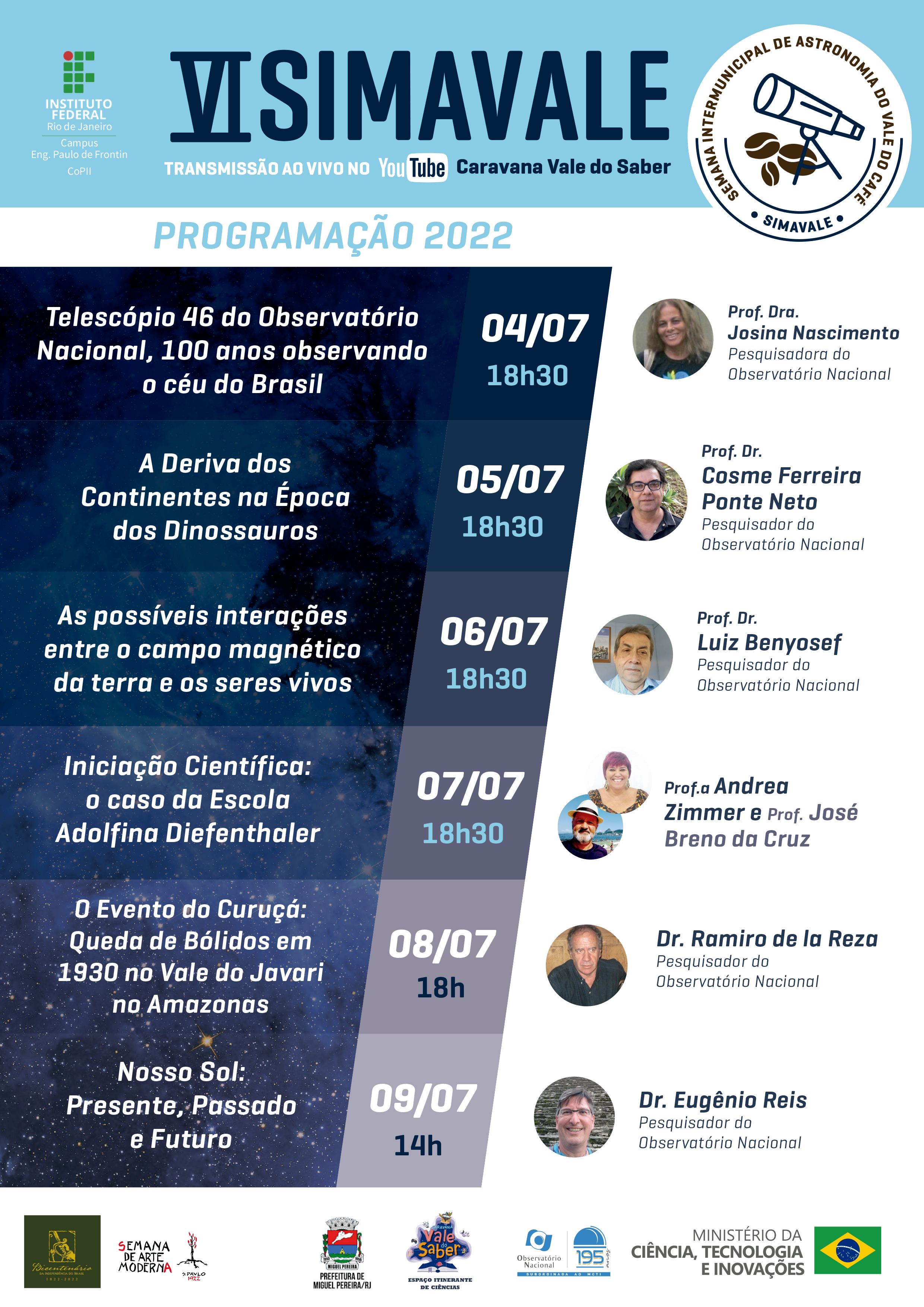 Entre os dias 04 e 09 de julho, ocorre a sexta edição da SIMAVALE – Semana Intermunicipal da Astronomia do Vale do Café. O evento contará com a participação de pesquisadores do Observatório Nacional – unidade de pesquisa vinculada ao Ministério da Ciência, Tecnologia e Inovações (ON/MCTI).