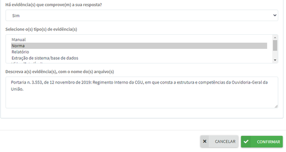 9. No campo Descreva a(s) evidência(s), é importante informar o nome do arquivo que será anexado e descrever mais informações sobre ele. Isso permite que se consiga identificar, dentre os anexos relacionados àquele objetivo, qual deles se refere a evidência de cada elemento. Caso queira explicar alguma peculiaridade acerca das evidências juntadas, esse campo de texto será útil para essa função. Uma vez preenchidas as informações relativas àquele elemento, clique em Confirmar.