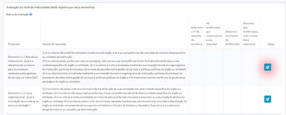 6. O primeiro campo a se preencher será a Matriz de Avaliação, para preenchê-lo, clique no botão azul na coluna Ações da matriz do objetivo. Cada elemento será preenchido separadamente, e os arquivos de evidências serão incluídos ao final do preenchimento de todos os elementos daquele objetivo.