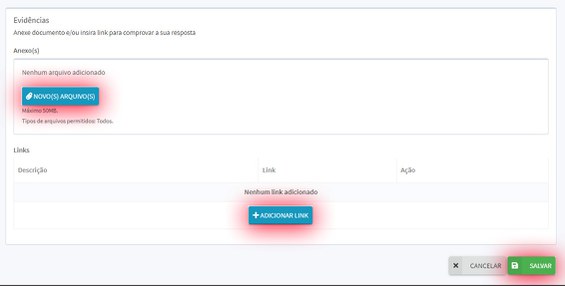 10. Depois de preencher todas as linhas da Matriz de Avaliação, anexe o(s) documento(s) descrito(s) e/ou insira link(s) com a(s) evidência(s) para comprovar a sua resposta. Clicando no botão Novos arquivos, é possível anexar quantos arquivos forem necessários, com capacidade total de 50MB. Para incluir mais link(s), basta clicar em Adicionar Link. Para concluir o preenchimento deste formulário, clique em salvar: (Atenção: Se for indicar um link, certifique-se que ele é de acesso público. Links que direcionam para intranet não são acessíveis para equipes externas.)
