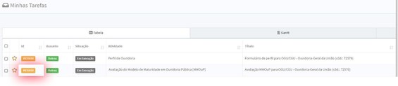 3. Na sequência, basta clicar novamente em Minhas Tarefas, conforme o primeiro passo deste tutorial, e clicar em no Id da Avaliação do Modelo de Maturidade em Ouvidoria Pública (MMOuP).