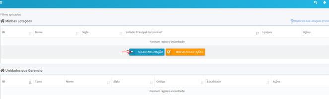3. Na próxima tela, clique em minhas unidades, depois em solicitar lotação e indique a sua unidade no seguinte formato: (SIGLA DA UNIDADE) /SISOUV (exemplo SISOUV/ABGF), por fim, clique em solicitar.
