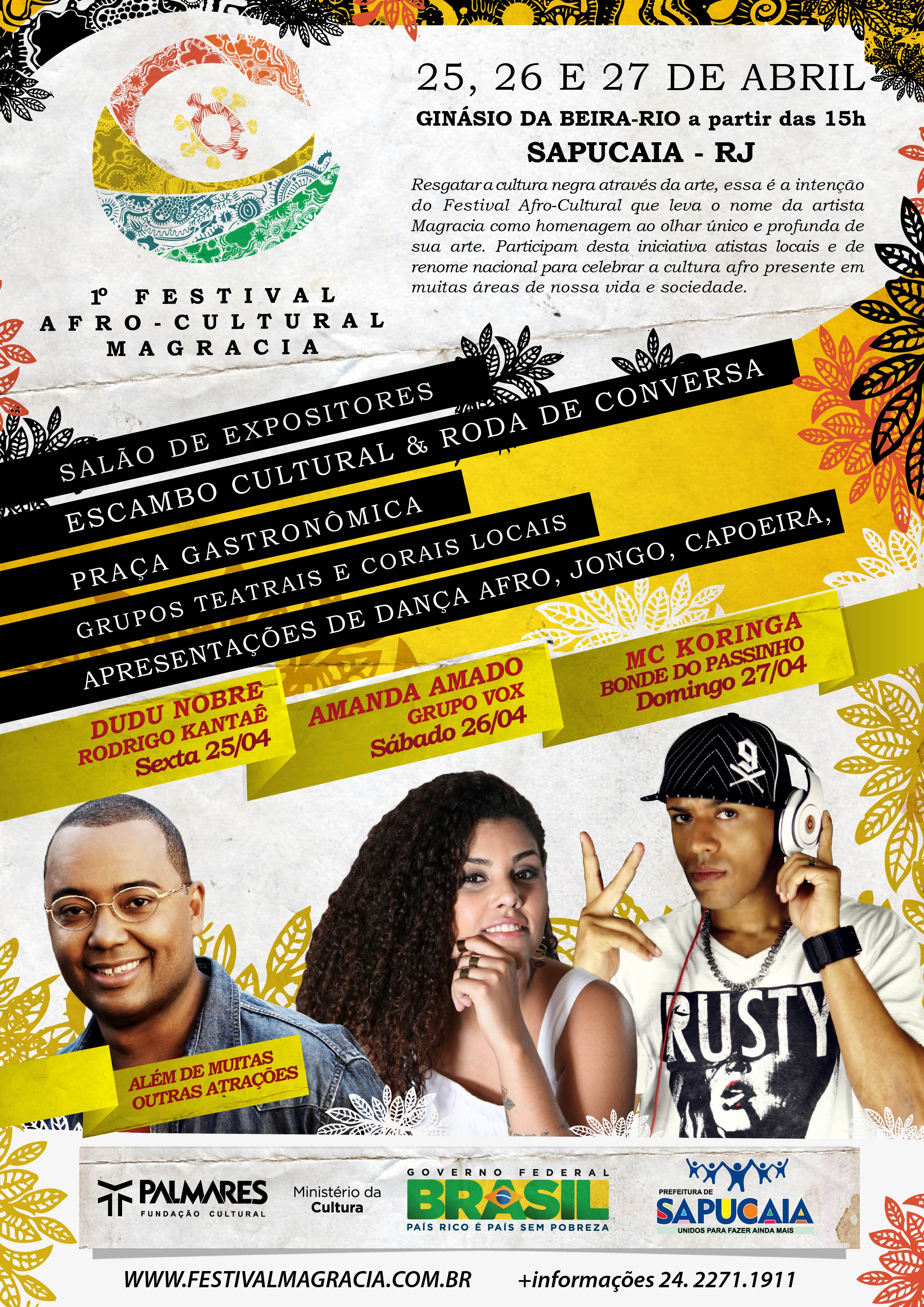 Música, jongo, capoeira, teatro, cinema, gastronomia, moda e reflexões sobre a diversidade cultural negra no Brasil. É o Festival Afro-cultural Magracia, que vai acontecer entre os dias 25 e 27 de abril em Sapucaia, na Região Centro-Sul Fluminense. Além dos shows e apresentações culturais, o Festival contará com um Salão voltado aos expositores de moda e artesanato afro. Dentre as performances musicais, destaque para Dudu Nobre, MC Koringa e a cantora Amanda Amado, destaque da segunda edição do programa The Voice Brasil.