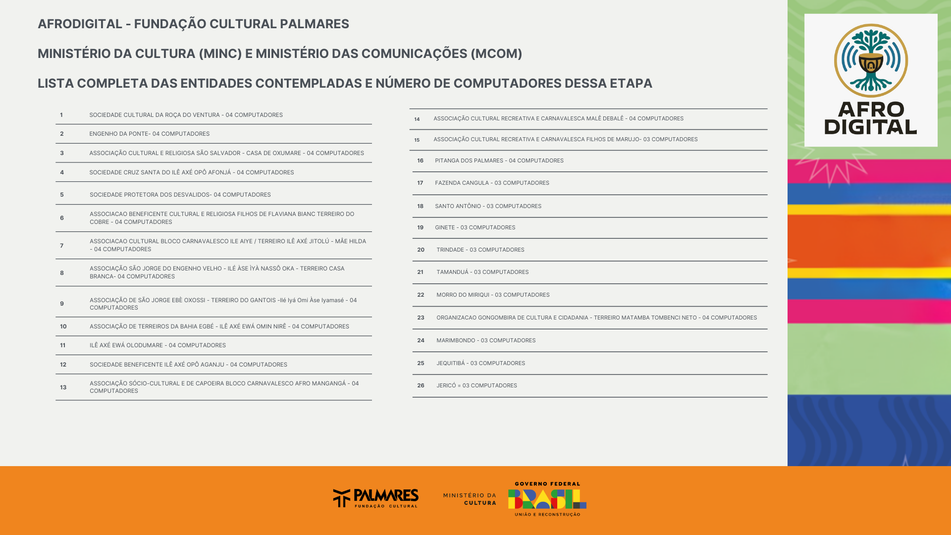 A coordenadora de Projetos da Fundação Cultural Palmares, do Departamento de Proteção ao Patrimônio Afro-Brasileiro (DPA), Cida Santos, reforçou a dimensão simbólica e prática da entrega: “Hoje é um dia histórico. Entidades baianas que representam comunidades quilombolas, povos de terreiros e fazedores da cultura receberam computadores do Programa AfroDigital, uma iniciativa conjunta do Ministério das Comunicações e Ministério da Cultura, coordenada pela Fundação Cultural Palmares. Essa ação garante acesso à conectividade e aos serviços públicos essenciais, promovendo a inclusão digital e social”.