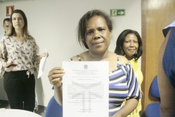Rosalinda Alves, da Comunidade Tubirava em Niquelândia, emocionada apoś receber a certidão em mãos diz: “ A sensação é de libertação, porque agora estamos documentados a certidão garante o valor judicial da luta pelos direitos de nós quilombolas”