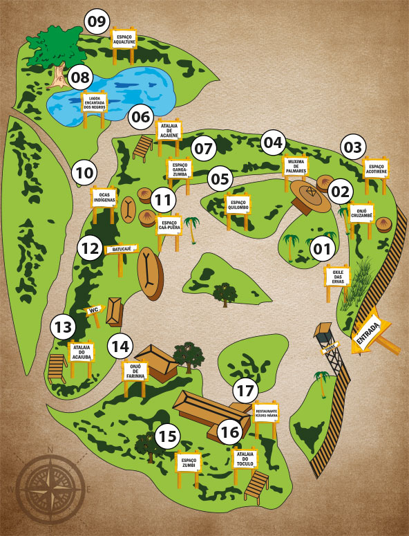 Nesta espécie de maquete viva, em tamanho natural, foram reconstituídas algumas das mais significativas edificações do Quilombo dos Palmares. Com paredes de pau-a-pique, cobertura vegetal e inscrições em banto e yorubá, avista-se o Onjó de farinha (Casa de farinha), Onjó Cruzambê (Casa do Campo Santo), Oxile das ervas (Terreiro das ervas), Ocas indígenas e Muxima de Palmares (Coração de Palmares).