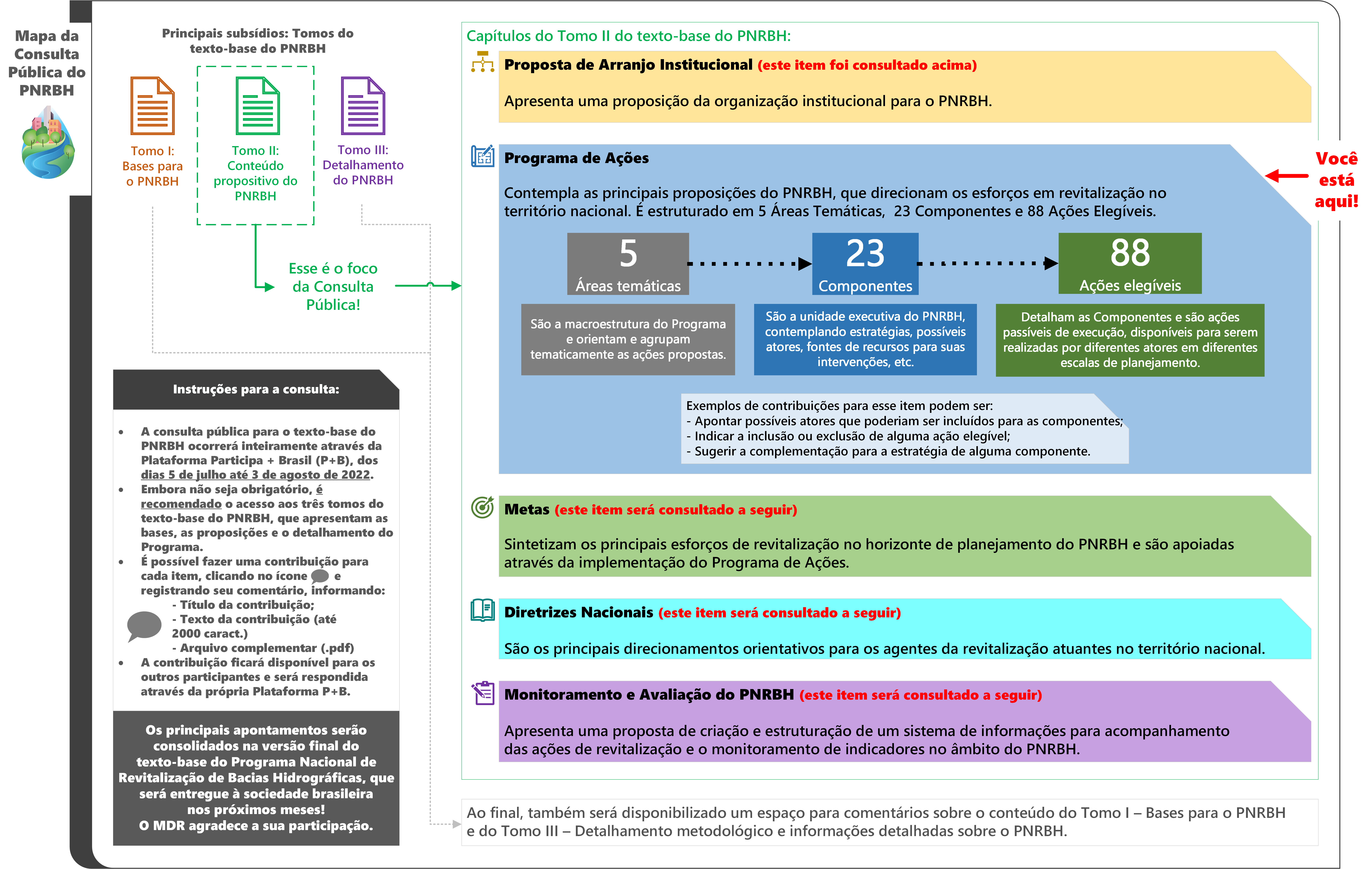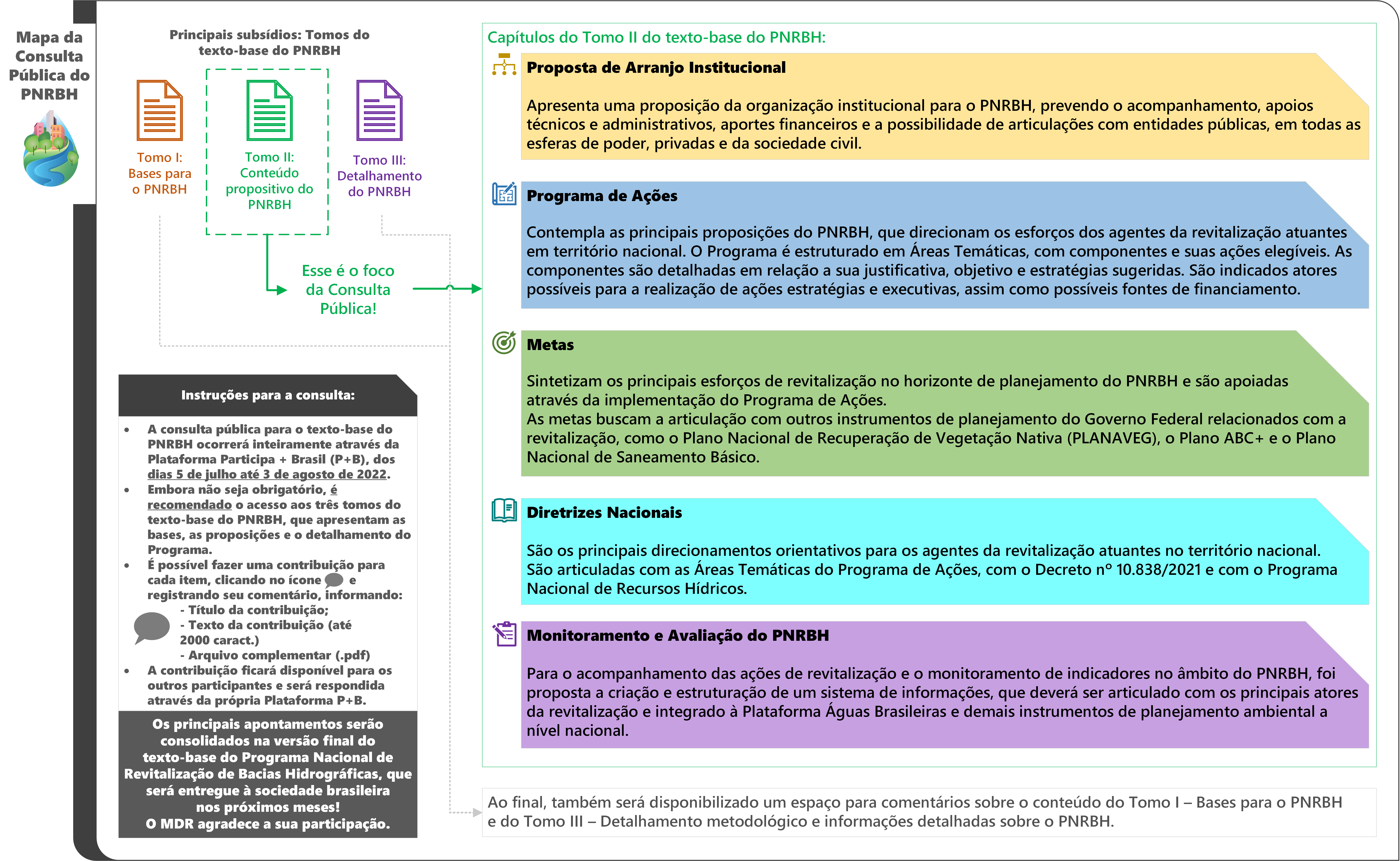 A principal ênfase dessa consulta é a obtenção de contribuições para o conteúdo propositivo do Texto-base do PNRBH, que é apresentado no Tomo II. Por isso, são disponibilizados espaços específicos para que sejam feitos comentários e apontamentos, em cada capítulo. Nos Tomos I e III não haverá espaços específicos para contribuições, estas poderão ser feitas no espaço geral do documento.