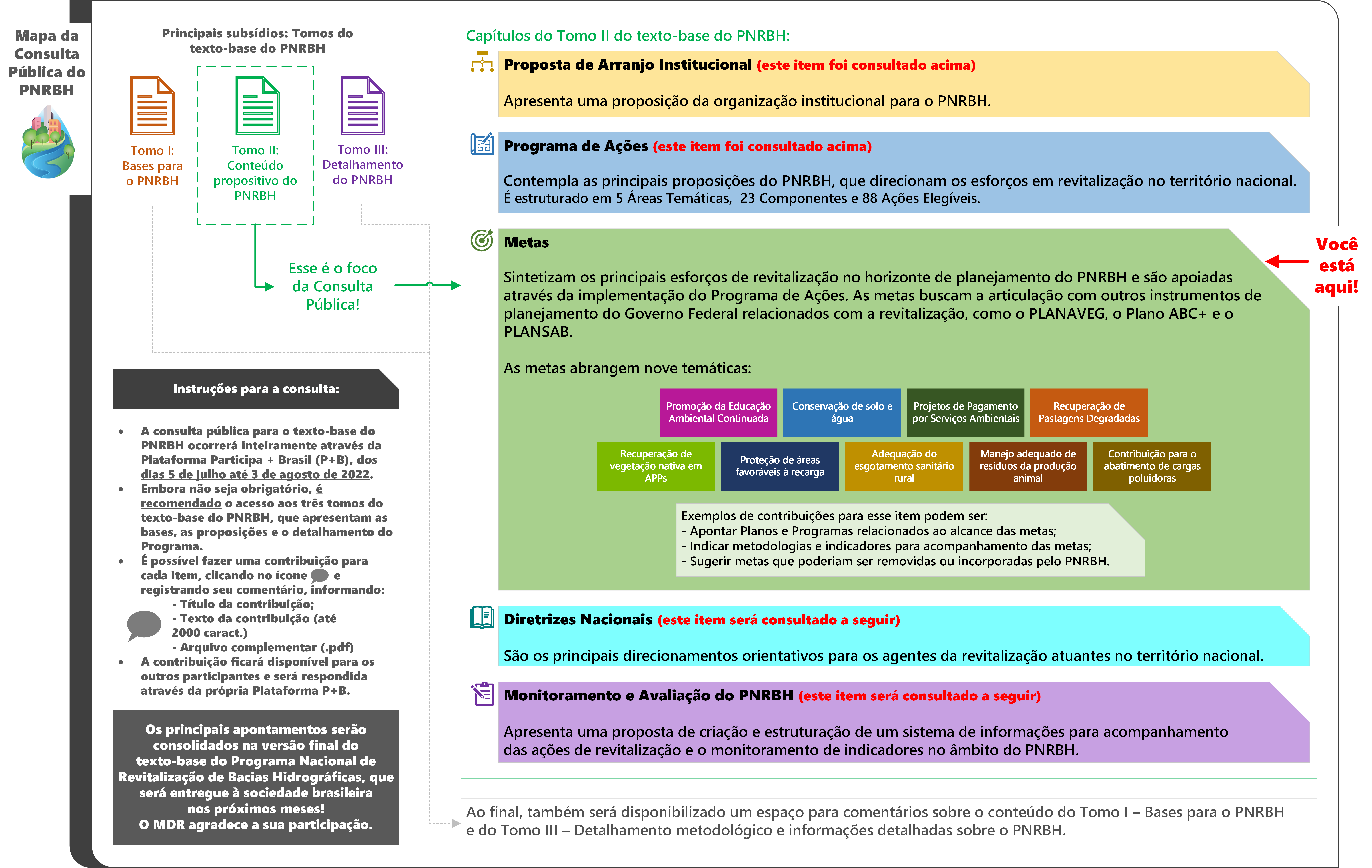 Mapa ilustrativo com o conteúdo da Consulta Pública sobre as Metas propostas no tomo II do texto-base do PNRBH.
