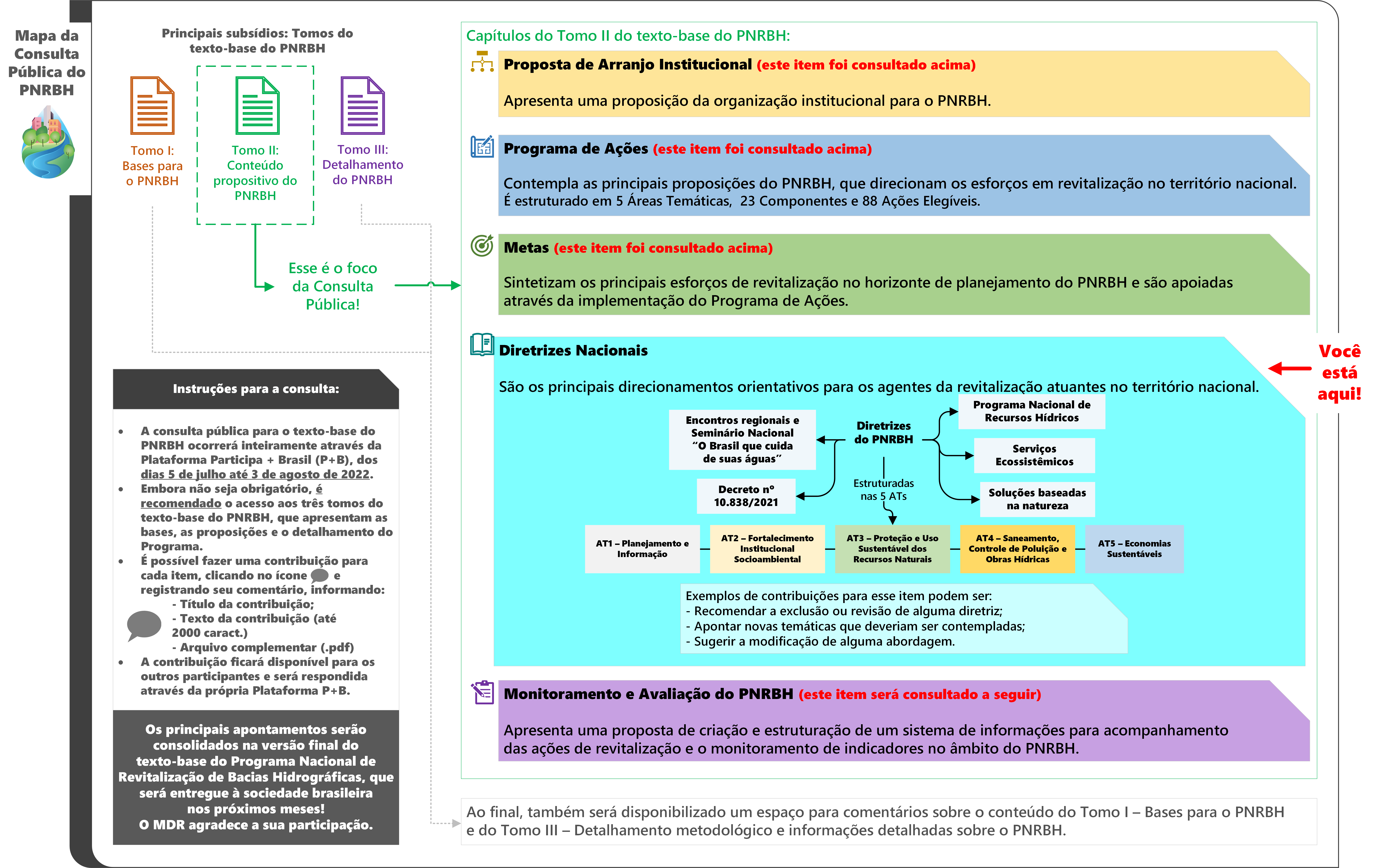 Mapa ilustrativo com o conteúdo da Consulta Pública sobre as Diretrizes propostas no tomo II do texto-base do PNRBH.