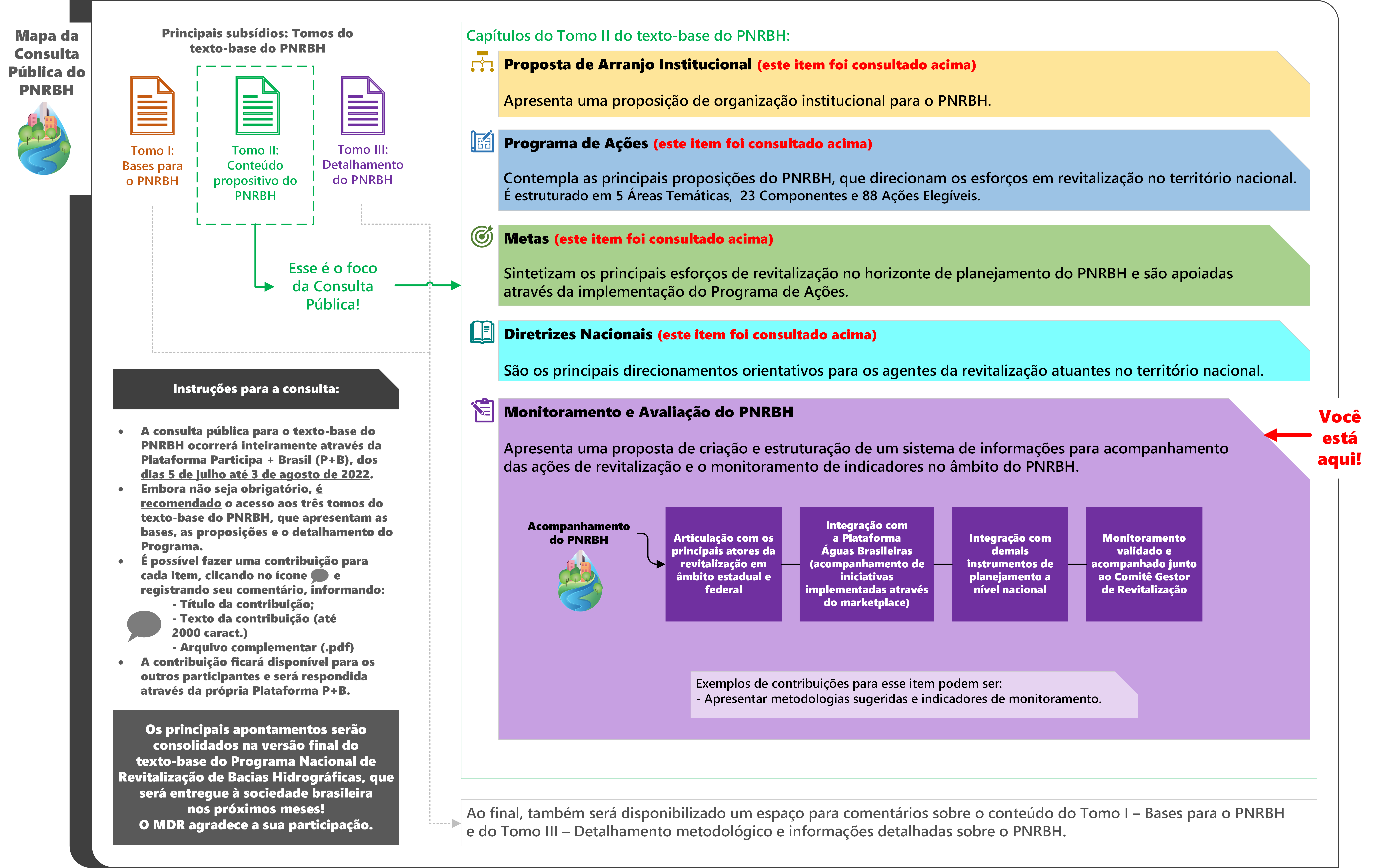 Mapa ilustrativo com o conteúdo da Consulta Pública sobre a proposta de Monitoramento e Avaliação do PNRBH apresentada no tomo II do texto-base.