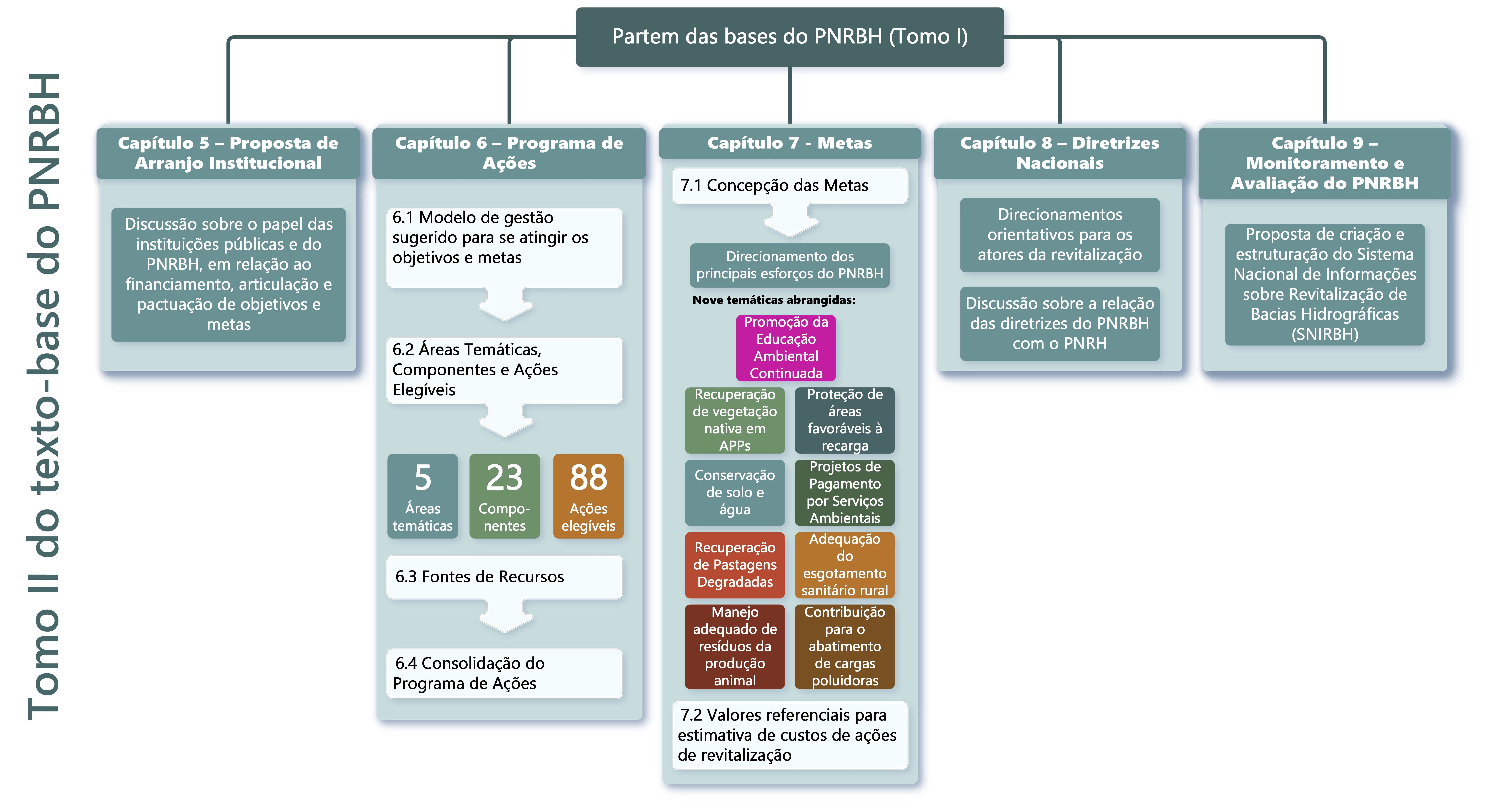 O Tomo II do Texto-Base do Programa Nacional de Revitalização de Bacias Hidrográficas (PNRBH) apresenta as principais proposições do Programa e é composto por: Arranjo Institucional; Programa de Ações; Metas; Diretrizes; e estratégia de monitoramento e avaliação.