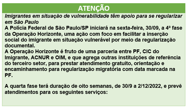 | Santos 1 | NUMIG/DELEX - Delegacia da PF em Santos | 09h00 - 17h00 | 09h00 - 17h00 |
