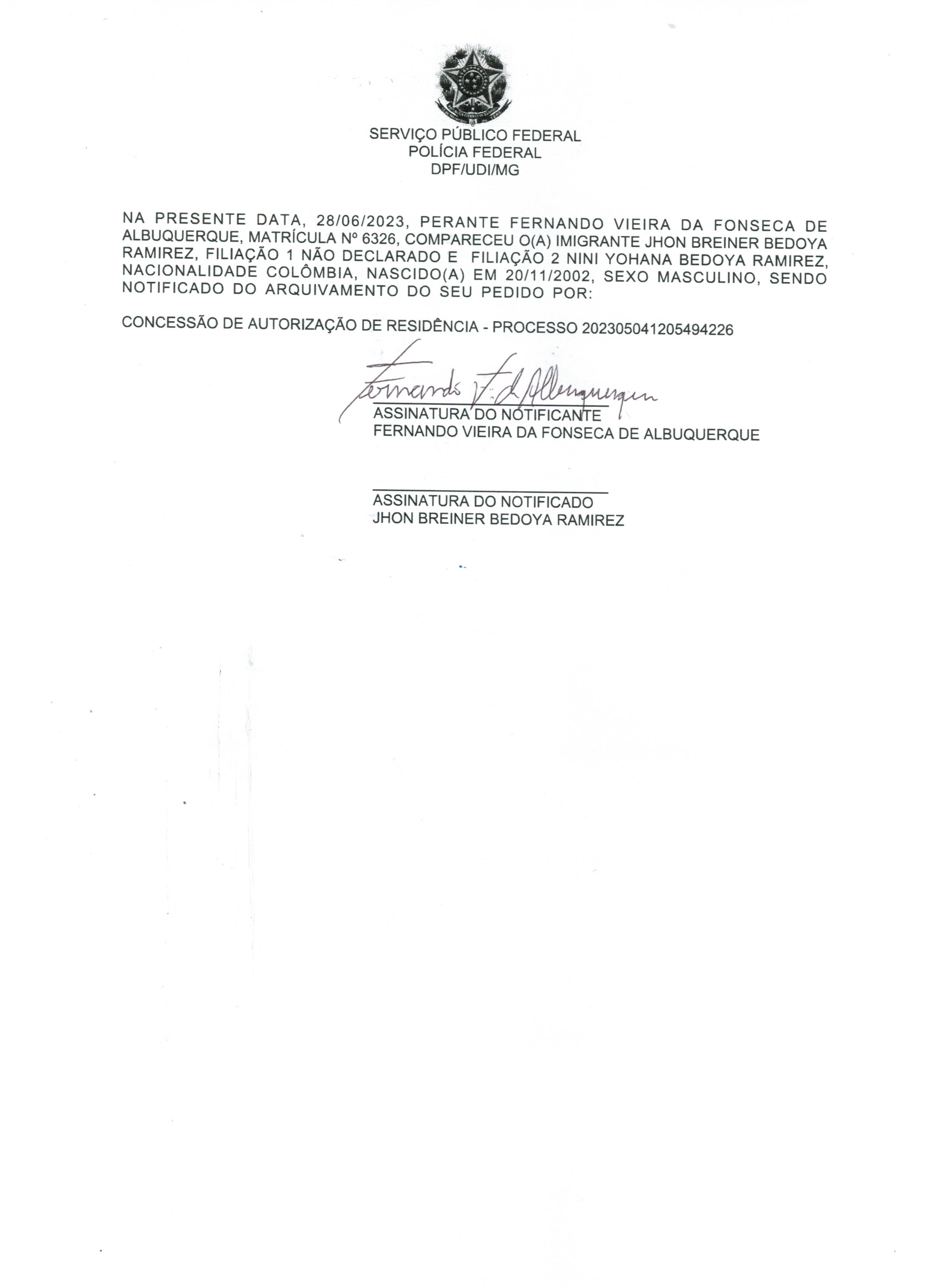 NOTIFICAÇÃO - Arquivamento da solicitação de Autorização de Residência