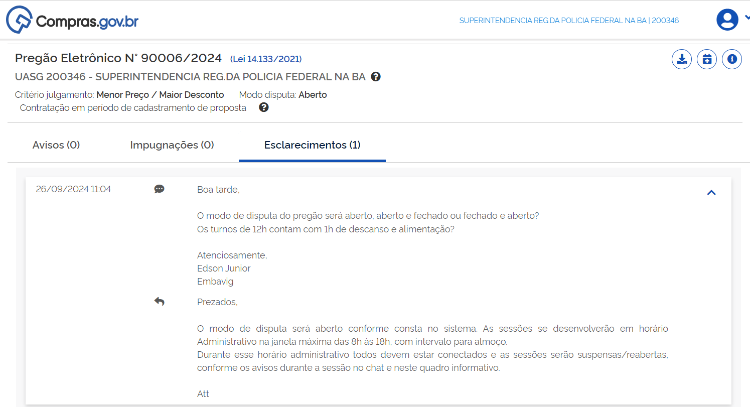 Solicitação/resposta encaminhada por e-mail e publicada no quadro de avisos do sistema Compras.