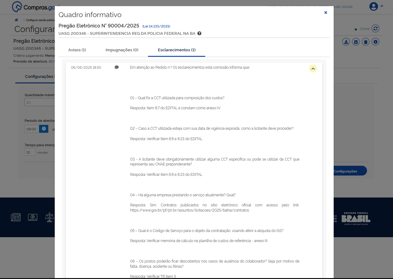 Resposta: Verificar que esta informação consta na primeira página do edital, bem como no sistema ComprasGov.