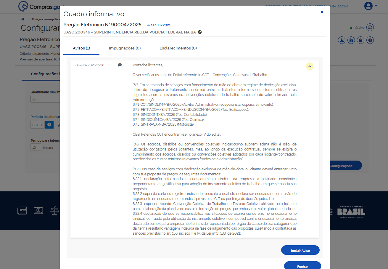 Favor verificar os itens do Edital referente às CCT – Convenções Coletivas de Trabalho: