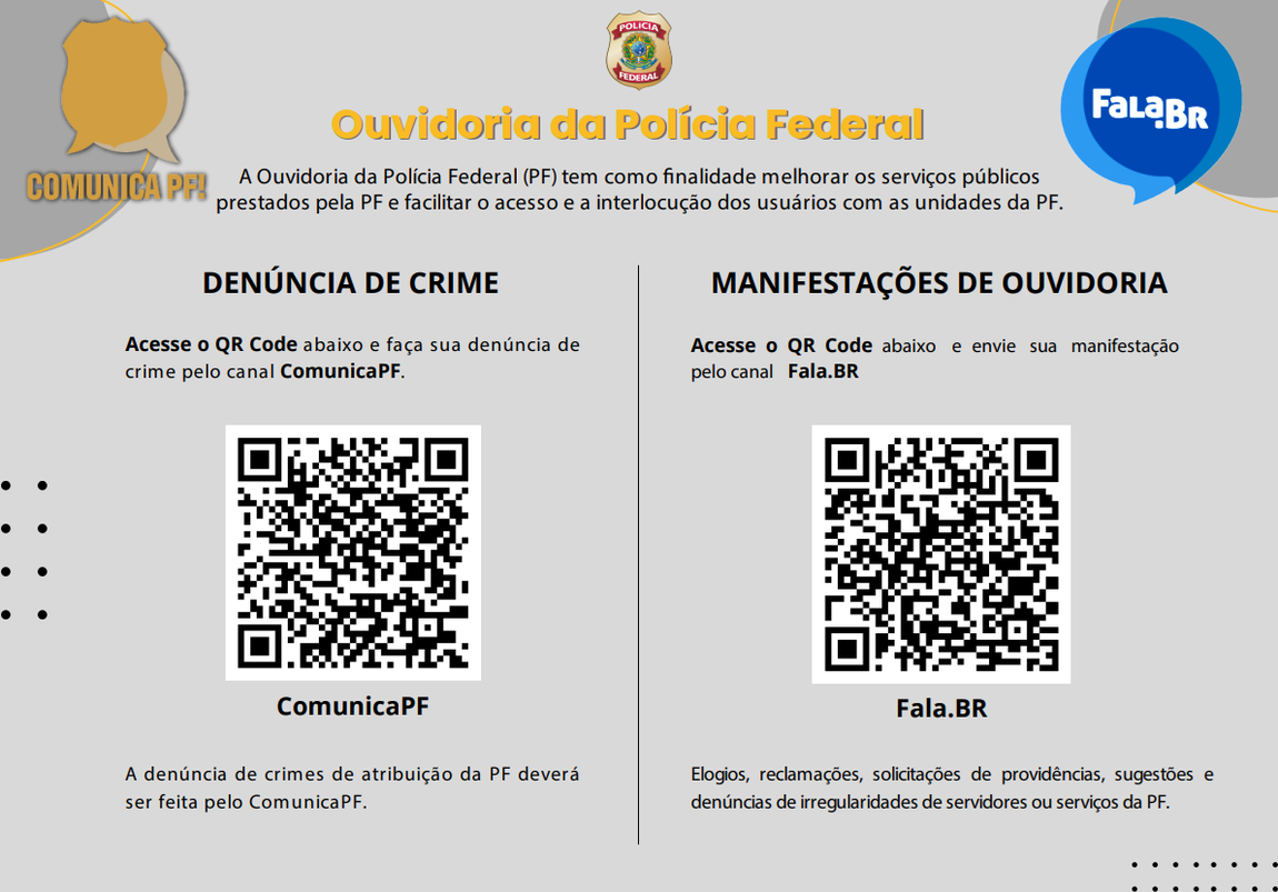 - Caso não tenha encontrado em nosso sítio as informações ou orientações que deseja, poderá encaminhar sua manifestação diretamente à Ouvidoria da Polícia Federal por meio da Plataforma Integrada de Ouvidoria e Acesso à Informação (Fala.BR), lembrando que, para melhor atendimento, é necessário o fornecimento de todas as informações úteis ao entendimento de sua demanda, como números de protocolo, locais e datas dos fatos, unidade do atendimento, nomes ou outros dados de identificação de pessoas envolvidas, dentre outras.