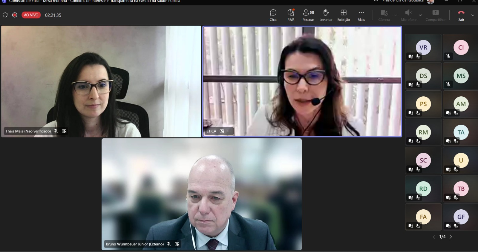 A Conselheira Maria Lúcia Barbosa, da Comissão de Ética Pública (CEP) da Presidência da República, participou de uma Mesa Redonda promovida pela Empresa Brasileira de Serviços Hospitalares (EBSERH) no dia 3 de dezembro de 2025. O evento, realizado virtualmente pela plataforma Teams, teve como foco o debate sobre "Ética, Conflito de Interesses e Transparência na Gestão da Saúde Pública".