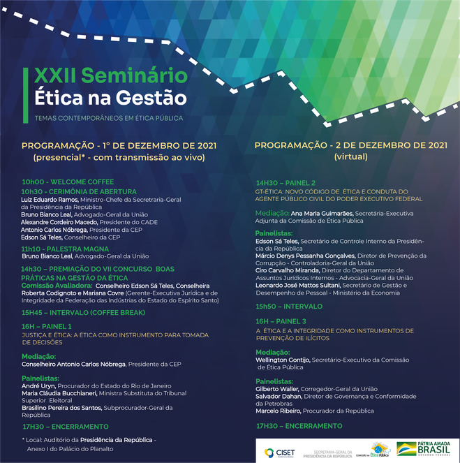 O Seminário Ética na Gestão - Temas Contemporâneos em Ética Pública, da Comissão de Ética Pública (CEP), está se aproximando. O evento será realizado nos dias 1º e 2 de dezembro, de forma presencial, com transmissão pelo Youtube. Confira, a seguir, a programação. Clique aqui para baixar o folder: