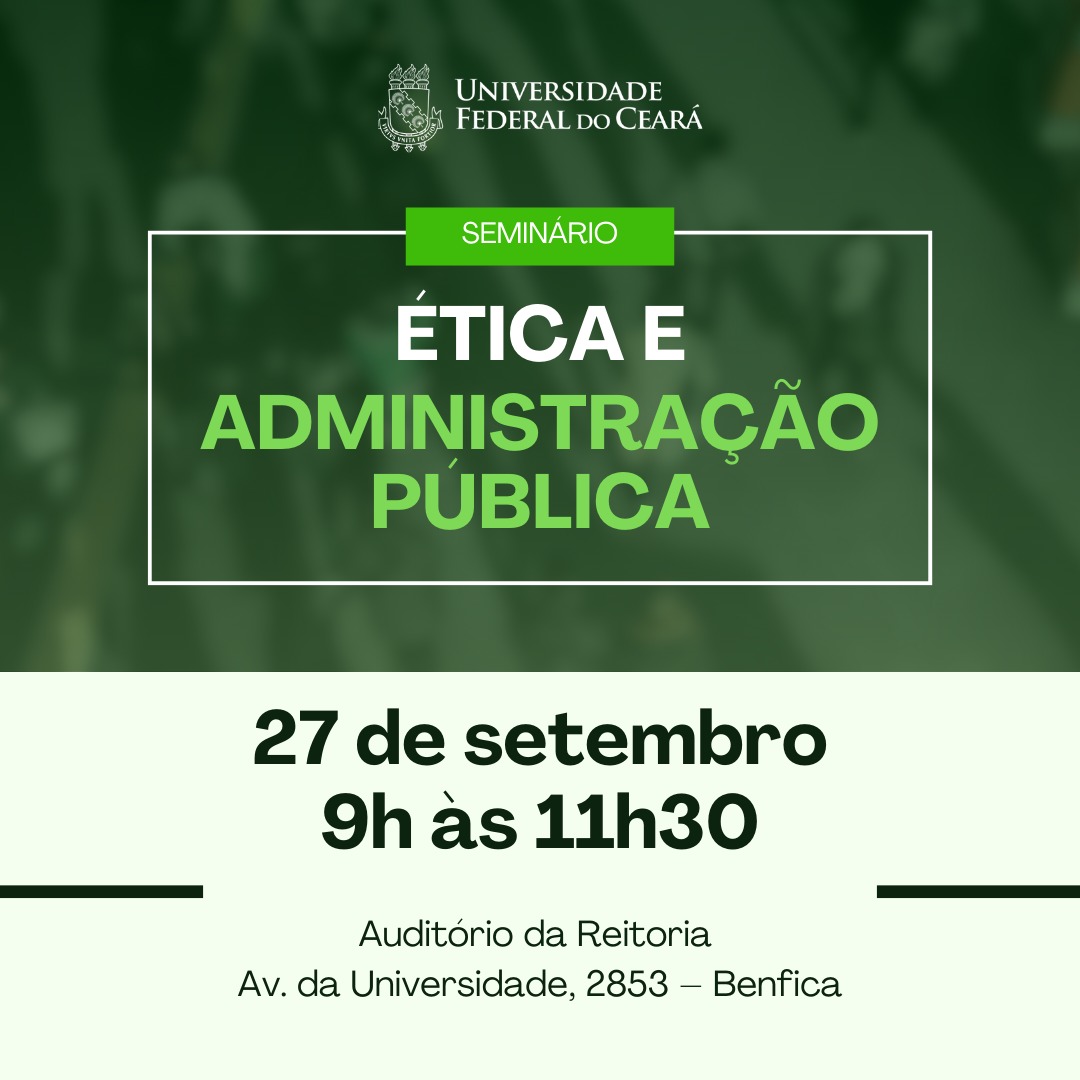 Órgão ao qual a comissão de ética setorial promotora é vinculada: Universidade Federal do Ceará (UFC) Evento: Seminário "Ética e Administração Pública" (11 anos da Comissão de Ética da UFC) Data e horário: 27 de setembro de 2024, às 9h