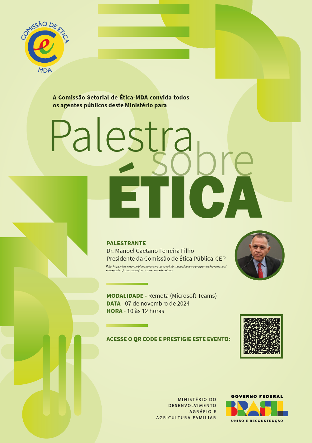Órgão ao qual a comissão de ética setorial promotora é vinculada: Ministério do desenvolvimento Agrário e Agricultura Familiar (MDA) Evento: Palestra sobre Ética Data e horário: 7 de novembro de 2024, das 10h às 12h