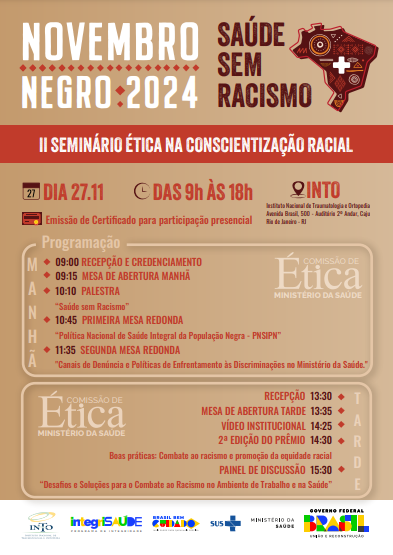 Órgão ao qual a comissão de ética setorial promotora é vinculada: Ministério da Saúde do Rio de Janeiro (MS/RJ) Evento: II Seminário Ética na Conscientização Racial: Saúde sem Racismo Data e horário: 27 de novembro de 2024, das 9h às 18h