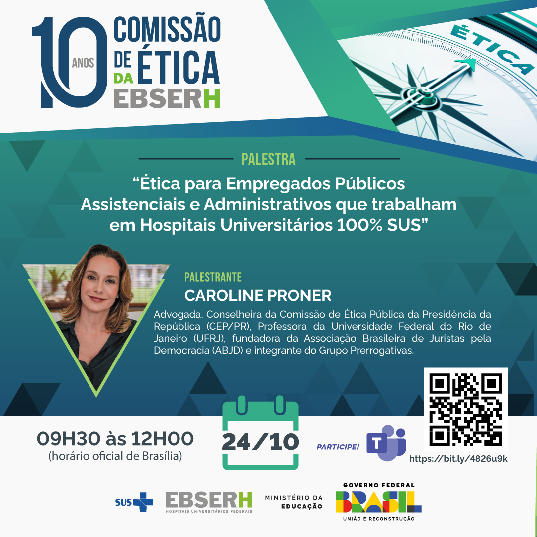 Órgão ao qual a comissão de ética setorial promotora é vinculada: Empresa Brasileira de Serviços Hospitalares (EBSERH) Evento: 10 anos da Comissão de Ética da EBSERH - Palestra sobre ética para Empregados Públicos que trabalham em hospitais universitários 100% SUS Data e horário: 24 de outubro de 2024, das 9h30 às 12h