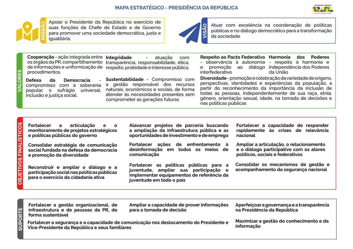 Abaixo apresentamos o o mapa estratégico da Presidência da República, suam Missão, Visão, Valores e Objetivos Estratégicos.