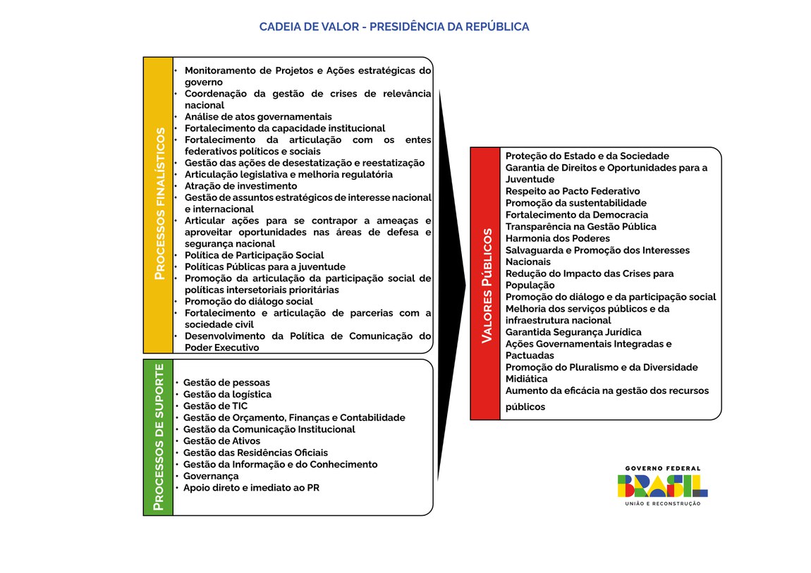 A Cadeia de Valor Integrada da Presidência da República foi elaborada a partir de oficinas e reuniões com os órgãos integrantes e da Vice-Presidência da República, e nela constam 10 macroprocessos de suporte e gestão, 16 macroprocessos finalísticos e 15 valores públicos.