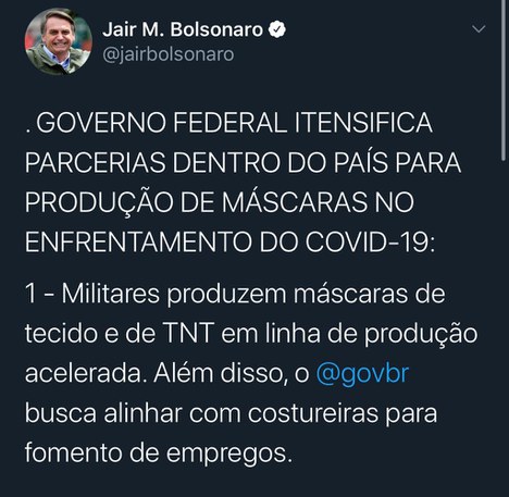 Nesta quarta-feira (22), o presidente Jair Bolsonaro destacou, em suas redes sociais, as parcerias firmadas dentro do País a fim de se produzirem máscaras e outros equipamentos de proteção contra o novo coronavírus. Além das atuação das Forças Armadas, a fabricação é realizada ainda por meio de parcerias com costureiras, para fomentar o emprego, e em presídios e universidades.