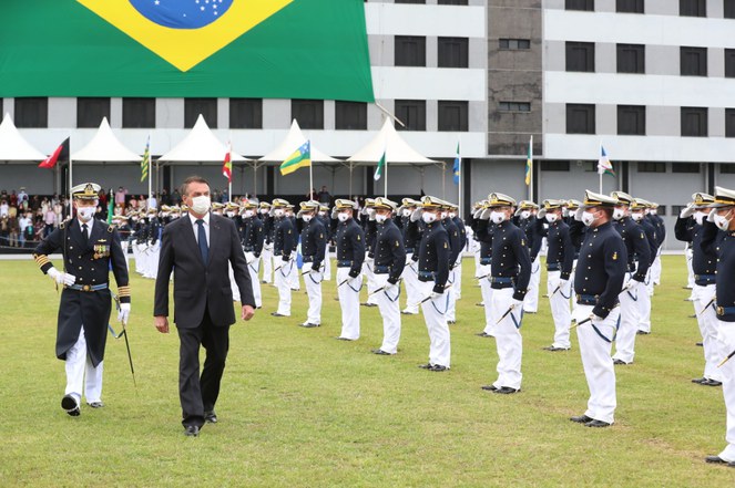 O Presidente da República, Jair Bolsonaro, participou, neste sábado (19), de cerimônia de juramento à Bandeira e entrega do Espadim a alunos da turma “Almirante Bosísio”, da Escola Naval, no Rio de Janeiro. O evento marca o encerramento do primeiro ano de preparação para o oficialato e a incorporação dos aspirantes à Marinha.
