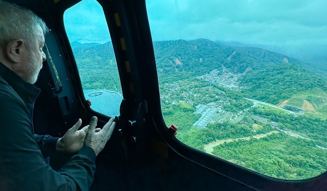| Sobrevoo do presidente Lula sobre regiões afetadas pelas chuvas no litoral norte paulista. Foto: Ricardo Stuckert/ PR |