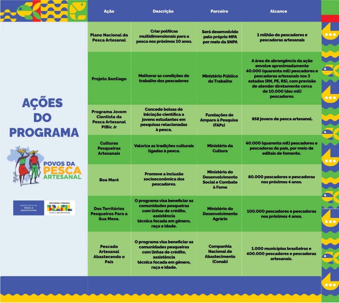 Sobre esse tema, o programa contém a ação Culturas Pesqueiras Tradicionais, em que o MPA e o Ministério da Cultura apoiarão as manifestações culturais dos pescadores artesanais, seus conhecimentos transmitidos ao longo de gerações sobre técnicas de pesca, seus mestres, mulheres sábias das águas, procissões marítimas, culinárias, danças, cantos, artesanatos, territórios.