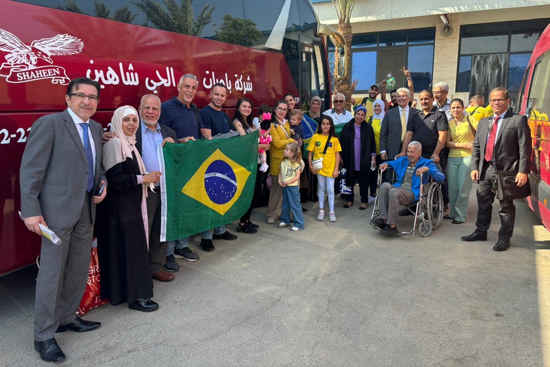 - Grupo de brasileiros repatriados pelo governo brasileiro na chegada a Jericó. Foto: Representação Brasileira em Ramala / Divulgação