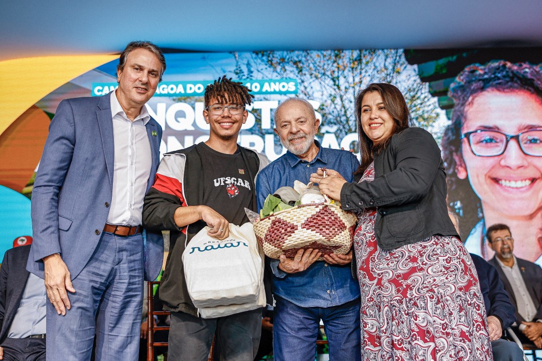 O presidente Lula e o ministro Camilo Santana (Educação) durante cerimônia de celebração dos 10 anos do campus Lagoa do Sino da UFSCar, no município de Buri, interior de São Paulo