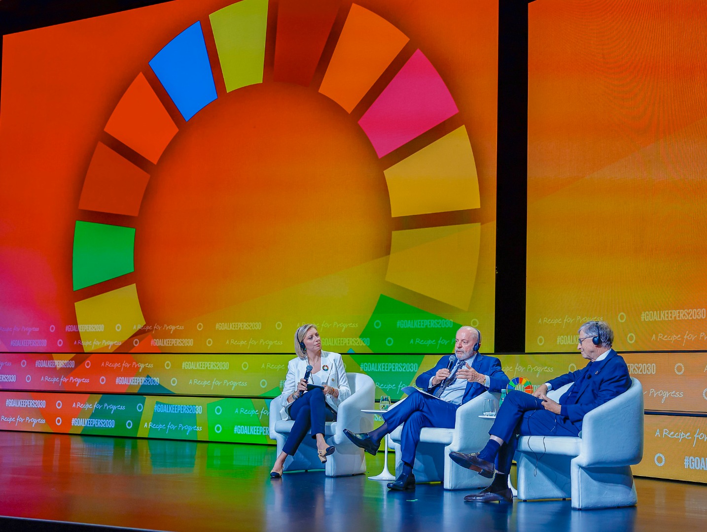 Presidente da Fundação Bill e Melinda Gates, Bill Gates e o Presidente da República, Luiz Inácio Lula da Silva, durante a cerimônia de Premiação anual da iniciativa Goalkeepers, organizada pela Fundação Bill e Melinda Gates, no Jazz at Lincoln Center. Nova York - Estados Unidos.