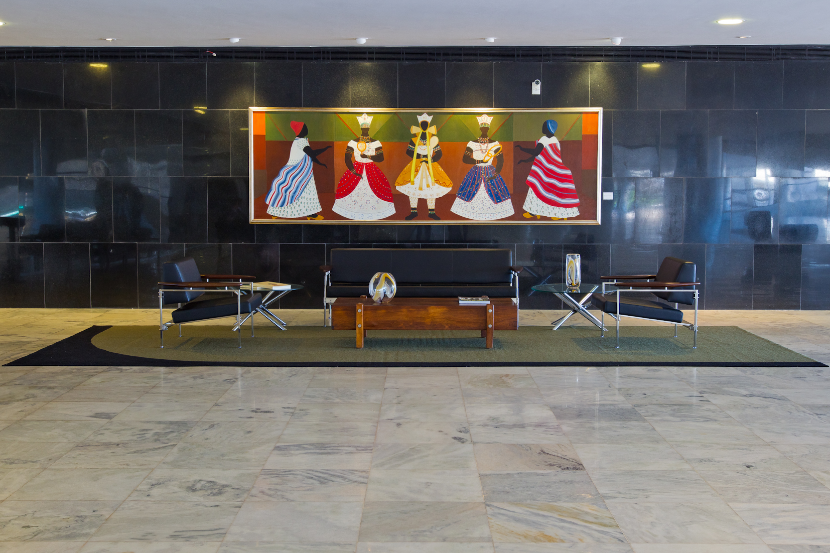 Detalhe do Salão Nobre - Sala de espera composta por conjunto Beto, desenhado, por Sérgio Rodrigues, em 1958, exclusivamente para o Palácio do Planalto. Mesa de centro Elle do mesmo designer, mesas laterais de Jorge Zalszupin. Tela "Orixás" de Djanira.