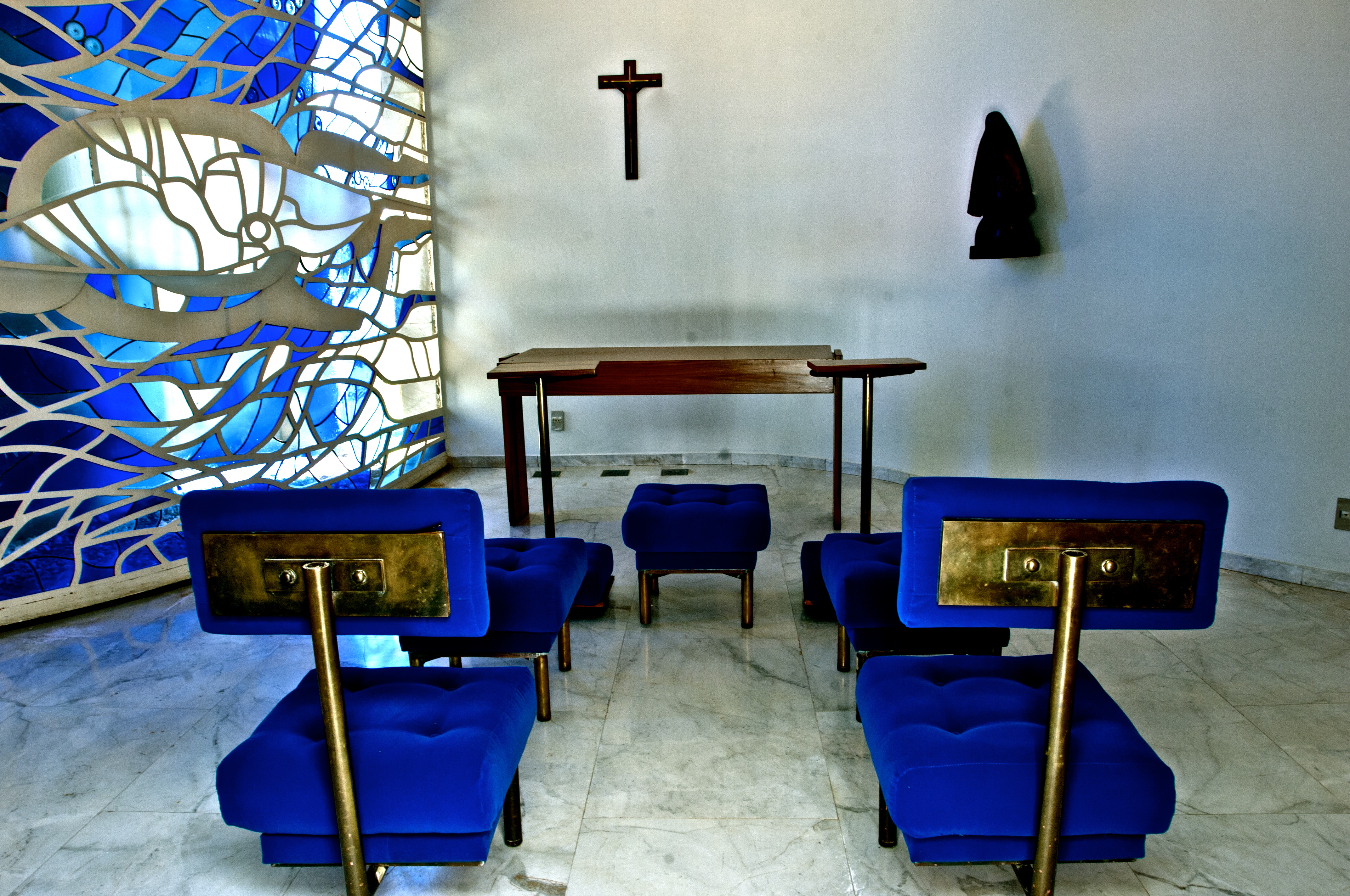 Piso em mármore branco e painel curvo em vidro transparente e colorido, de Mariane Peretti, que também projetou o conjunto de vitrais da Catedral de Brasília