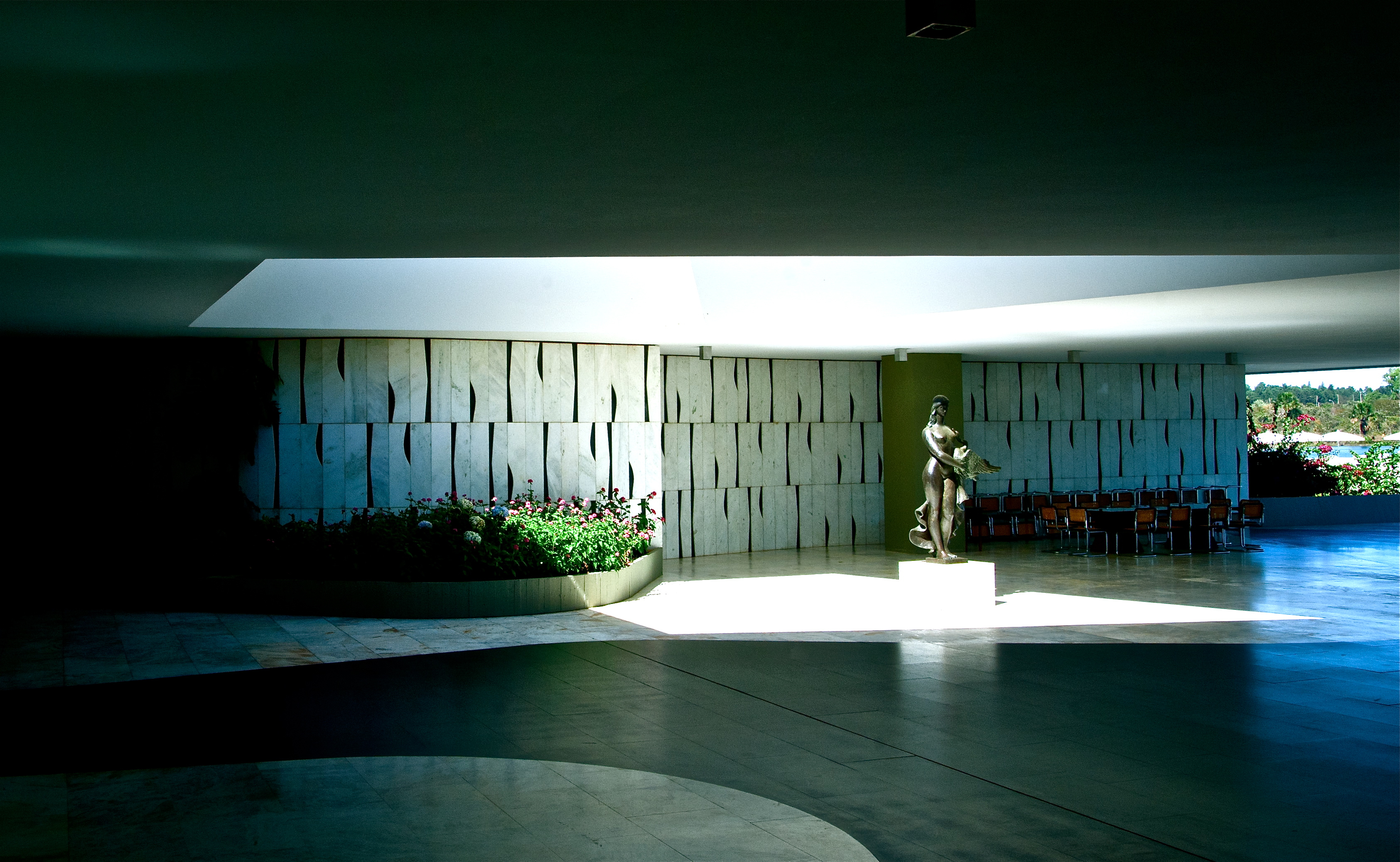 Em destaque, a escultura em bronze, Leda e o Cisne, de Alfredo Ceschiatti e, ao fundo, painel de Athos Bulcão