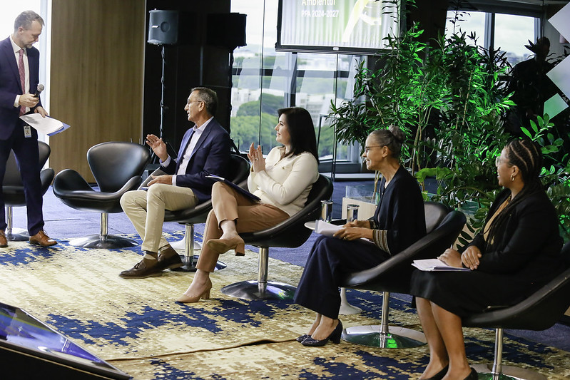 As ministras Simone Tebet e Marina Silva, a ministra substituta Roberta Eugenio, o ministro Waldez Goes e o representante do BID no Brasil, Morgan Doyle