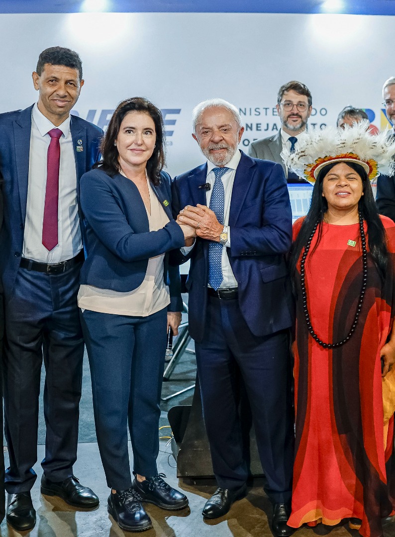 Antes da cerimônia, o presidente Lula visitou alguns estandes da Caravana, entre eles o do MPO. A ministra Simone Tebet apresentou para ele uma nova plataforma, em desenvolvimento no MPO, chamada Munis, que reúne informações socioeconômicas municipais e estaduais.