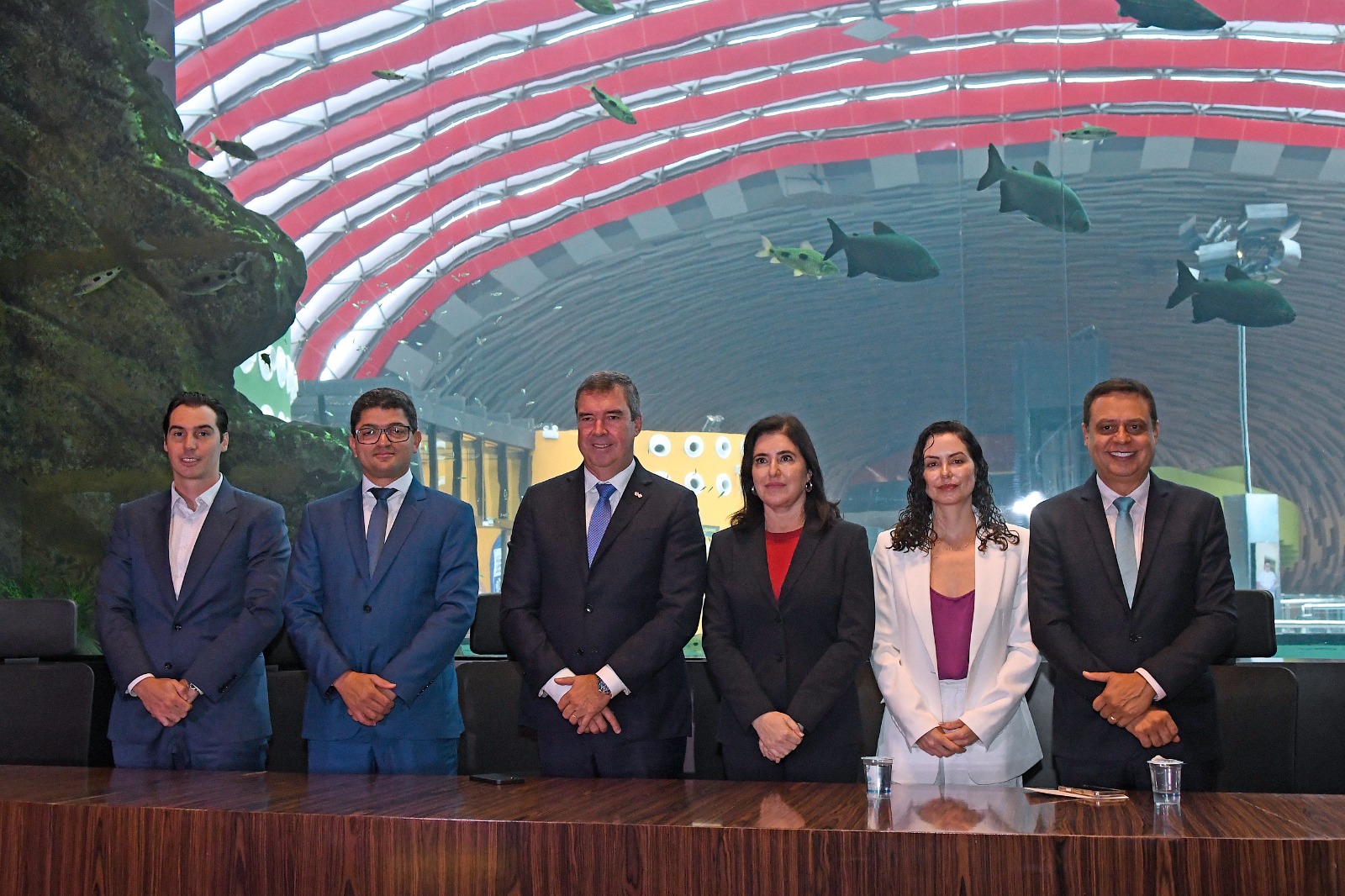 - Autoridades na abertura oficial do Conseplan. Da esquerda para a direita: secretário de Governo e Gestão Estratégica do Mato Grosso do Sul, Rodrigo Perez; secretário de Planejamento de Pernambuco e presidente do Conseplan, Fabrício Marques; governador do Rio Grande do Sul, Eduardo Riedel; ministra do Planejamento e Orçamento, Simone Tebet; secretária Nacional de Planejamento, Virgínia de Ângelis e o presidente do Consefaz e do Conselho Gestor do IBS, Flávio Oliveira. Fotos: Governo do MS.