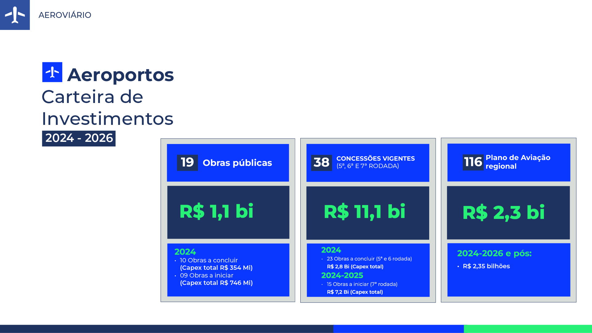Silvio Costa Filho reforçou o empenho do Governo Federal na regionalização aeroportuária para o desenvolvimento econômico regional. "Saímos no final do governo passado de investimentos públicos, sobretudo na Aviação Regional, de R$ 125 milhões para R$ 187 milhões e vamos chegar a 2024 com mais de R$ 500 milhões em investimentos", disse. Além disso, foi anunciado um investimento de R$ 2 bilhões para o aeroporto de Congonhas, em São Paulo (SP).