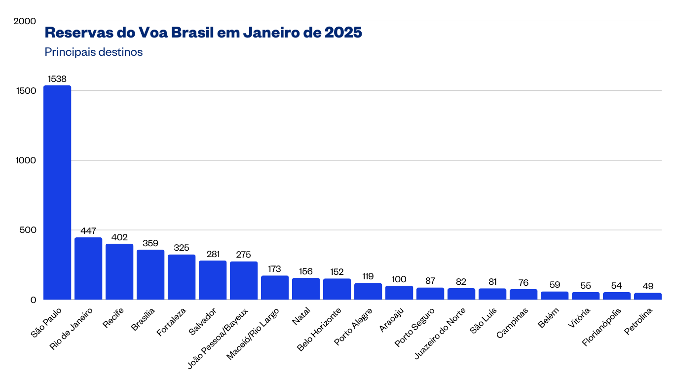 Considerado o primeiro programa social da aviação brasileira, o Voa Brasil chegou a 28.500 reservados em seis meses, o que seria suficiente para preencher 220 aeronaves lotadas de aposentados. Os números obtidos em janeiro – 5.308 bilhetes – foram 15% melhor que o recorde anterior, registrado em agosto, logo após o lançamento do programa.Os principais destinos dos beneficiados continuam concentrados nas regiões Sudeste (44%) e Nordeste (40,5%), mas há cidades de todas as regiões entre os vinte primeiros lugares: São Paulo, Rio de Janeiro, Recife, Fortaleza, Brasília, Salvador, João Pessoa/Bayeux, Maceió/Rio Largo, Natal, Belo Horizonte/Confins, São Luís, Aracaju, Campinas, Porto Seguro, Juazeiro do Norte, Porto Alegre, Belém e Vitória.