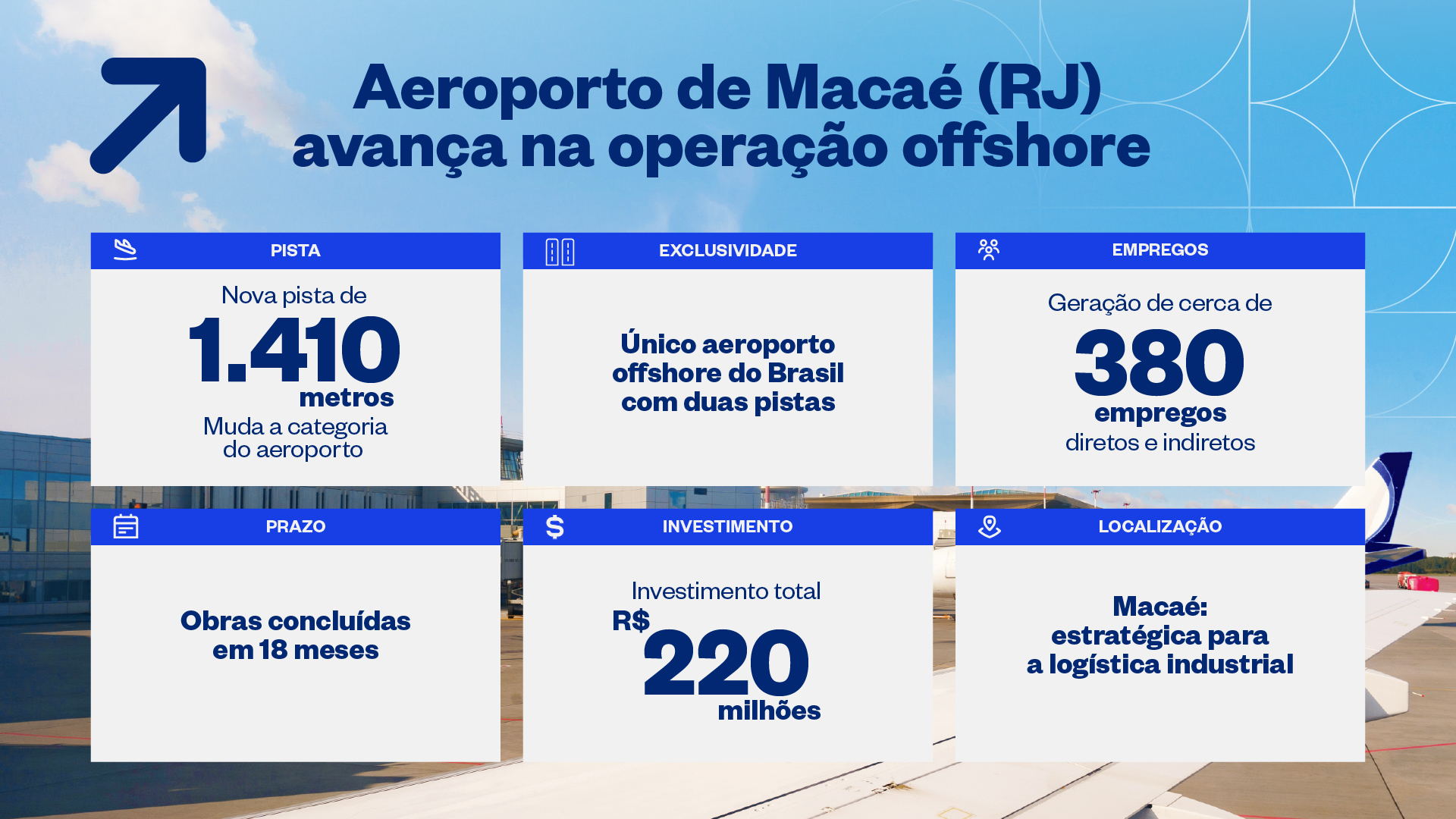 Com investimento de R$ 220 milhões, a obra foi executada pela Zurich Airport Brasil e integra o Plano Aeroviário Nacional (PAN). O projeto fortalece a infraestrutura voltada à indústria offshore e gerou cerca de 380 empregos diretos e indiretos, entre junho de 2023 e dezembro de 2024.