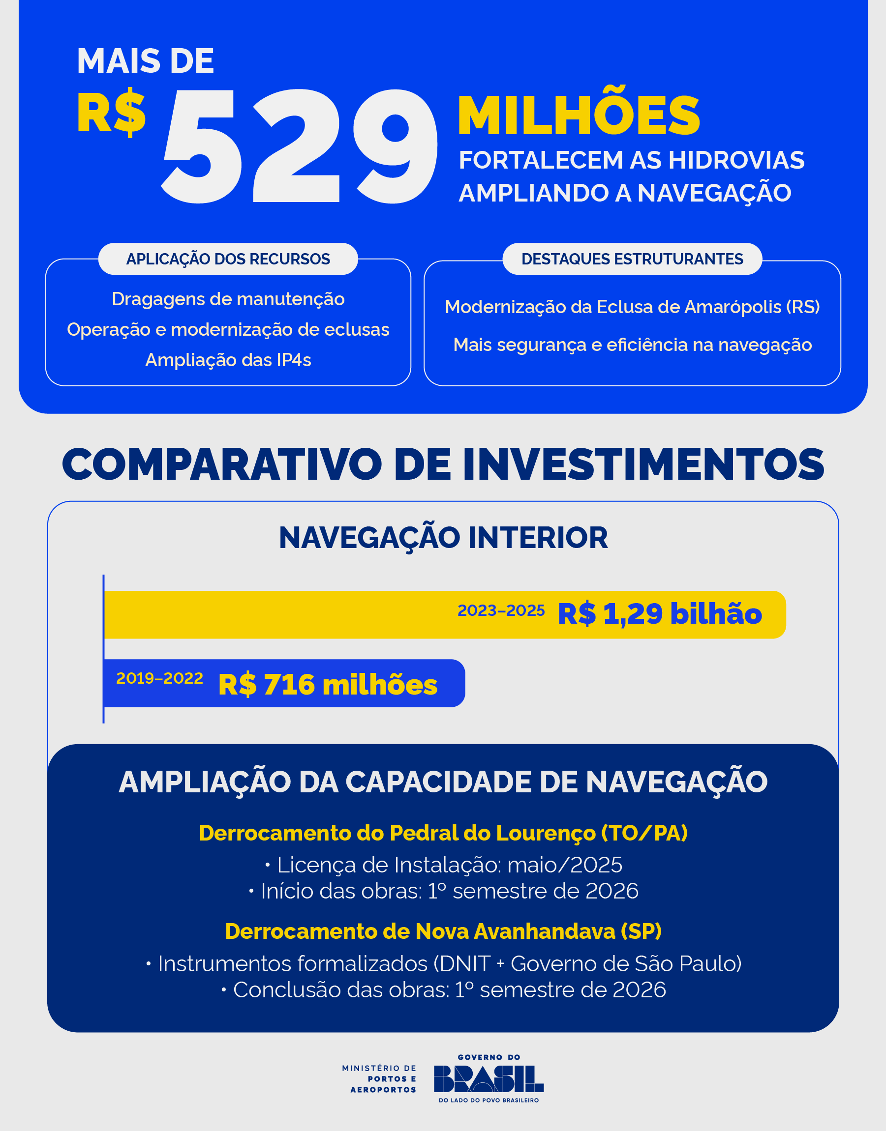 A navegação interior se tornou uma prioridade nas políticas públicas do governo brasileiro. Somente entre os anos de 2023 e 2025, foram investidos cerca de R$ 1,29 bilhão no setor, valor superior ao que foi investido no período de 2019 e 2022, que somaram apenas R$ 716 milhões.