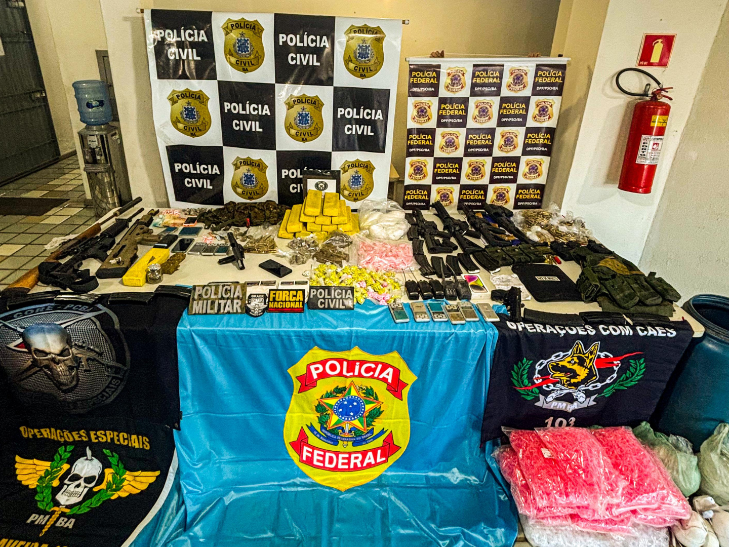 Ao todo, foram cumpridos oito mandados de busca e apreensão em imóveis ligados a suspeitos de envolvimento com homícidios, tráfico de drogas e ocupação ilegal em Terras Indígena no extremo sul da Bahia. Foram apreendidos cinco fuzis, quatro pistolas, um revólver, um rifle, diversos tipos de munição e diferentes porções de cocaína, crack, maconha e ecstasy.