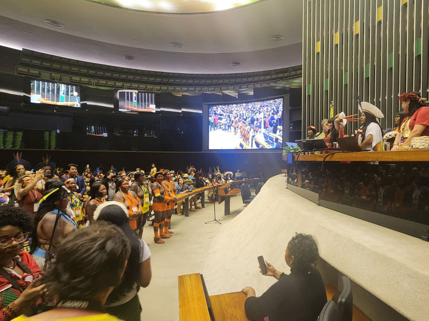 A Bancada do Cocar, composta por deputados que representam os interesses dos povos indígenas na Câmara, também participou ativamente da cerimônia, reafirmando o compromisso com a defesa dos direitos dos povos originários e do meio ambiente. Em sua intervenção no final da sessão, a deputada Célia Xakriabá, destacou a importância de garantir maior representatividade indígena nas casas legislativas, especialmente em momentos como esse, quando decisões legislativas ameaçam diretamente a proteção territorial e os direitos das comunidades. “É tempo de reflorestar a política e o Congresso Nacional. Precisamos ter mais presença. Mais uma vez, reforço a importância de estarmos juntos. Apesar dos obstáculos, nós estamos aqui”, disse.
