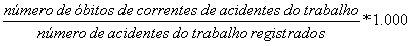 O coeficiente é calculado pelo número de óbitos decorrentes dos acidentes do trabalho e o número total de acidentes, conforme descrito abaixo: